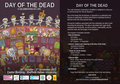 La celebración tendrá un Altar de Día de Muertos en exhibición del 30 de octubre al 3 de noviembre, en la Gallería SIA de Sheffield Hallam University. El programa de actividades inicia con una conferencia sobre los orígenes y el significado del «Día de Muertos», presentada por la Dra. Elizabeth Baquedano, de la University College London. La conferencia se llevará a cabo a las 6:00 de la tarde el 30 de octubre en las instalaciones de la Universidad de Sheffield.