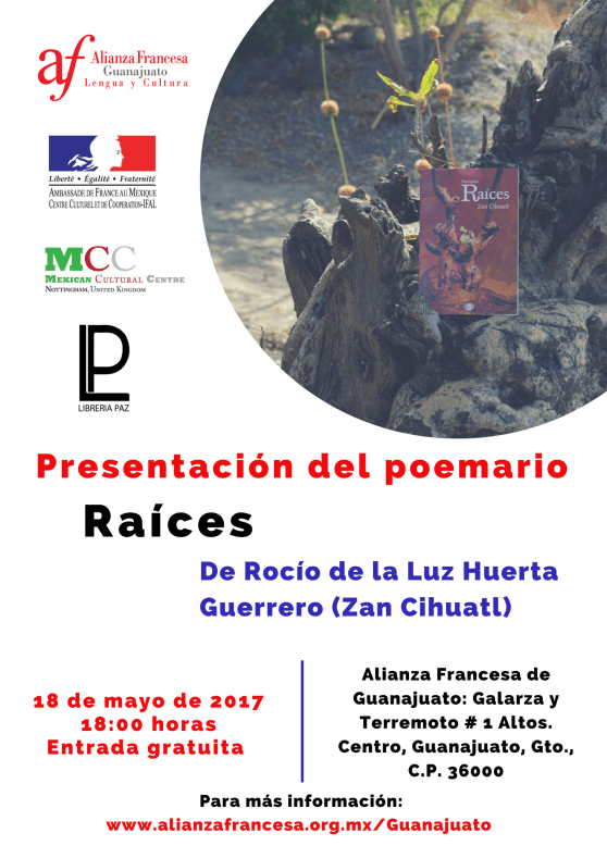 Presentación del poemario «Raíces» de Rocío de la Luz Huerta Guerrero (Zan Cihuatl) Publicado el mayo 11, 2017 por The Mexican Cultural Centre (MCC), United Kingdom. Comparte esto: Haz clic para compartir en X (Se abre en una ventana nueva) X Haz clic para compartir en Facebook (Se abre en una ventana nueva) Facebook Me gusta Cargando... Relacionado