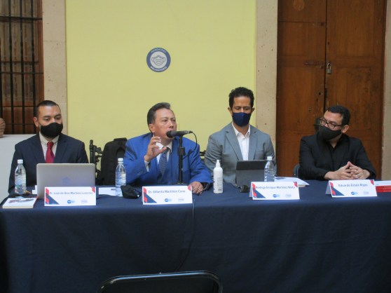 De izquierda a derecha: El Dr. Juan de Dios Martínez Lozornio, el Juez y Dr. Gilberto Martiñón Cano, el Dr. Rodrigo Enrique Martínez Nieto, Eduardo Estala Rojas, en el Museo Conde Rul. Fotografía: Antonio Galván García.