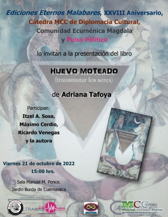 Presentación editorial: «Huevo moteado (trasmutar los seres)» Publicado el septiembre 27, 2022 por The Mexican Cultural Centre (MCC), United Kingdom. Comparte esto: Haz clic para compartir en X (Se abre en una ventana nueva) X Haz clic para compartir en Facebook (Se abre en una ventana nueva) Facebook Me gusta Cargando... Relacionado