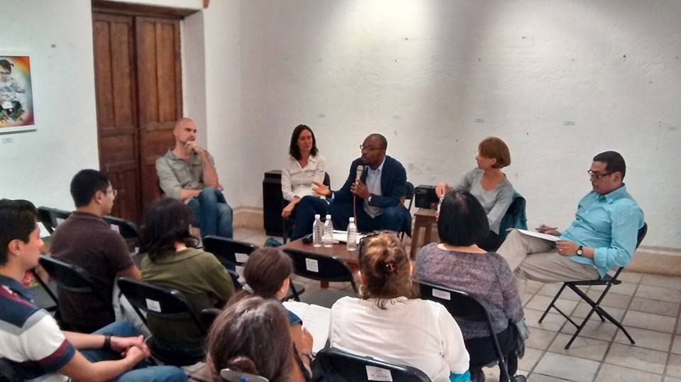 Encuentro “Voces de la interculturalidad en México”, en la Alianza Francesa de Guanajuato, México. Participaron: Laurence Cuvillier, Jean Eddy Saint Paul, Benjamin de Brousse, Eva Conraud y Eduardo Estala Rojas, director general del Mexican Cultural Centre (MCC), Reino Unido. Evento organizado por la Alianza Francesa de Guanajuato, México, en colaboración con la Embajada de Francia en México, la Universidad Iberoamericana León, la Universidad de Guanajuato, el Mexican Cultural Centre (MCC), Reino Unido, y el Hotel Murillo Plaza de Guanajuato. Foto: Jeremy Anaya. 2015.