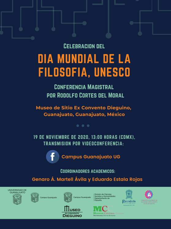 Como parte de la celebración del Día Mundial de la Filosofía, UNESCO, se estrenó a nivel internacional una videoconferencia magistral impartida por Rodolfo Cortés del Moral, profesor investigador del Departamento de Filosofía de la Universidad de Guanajuato (UG), México.