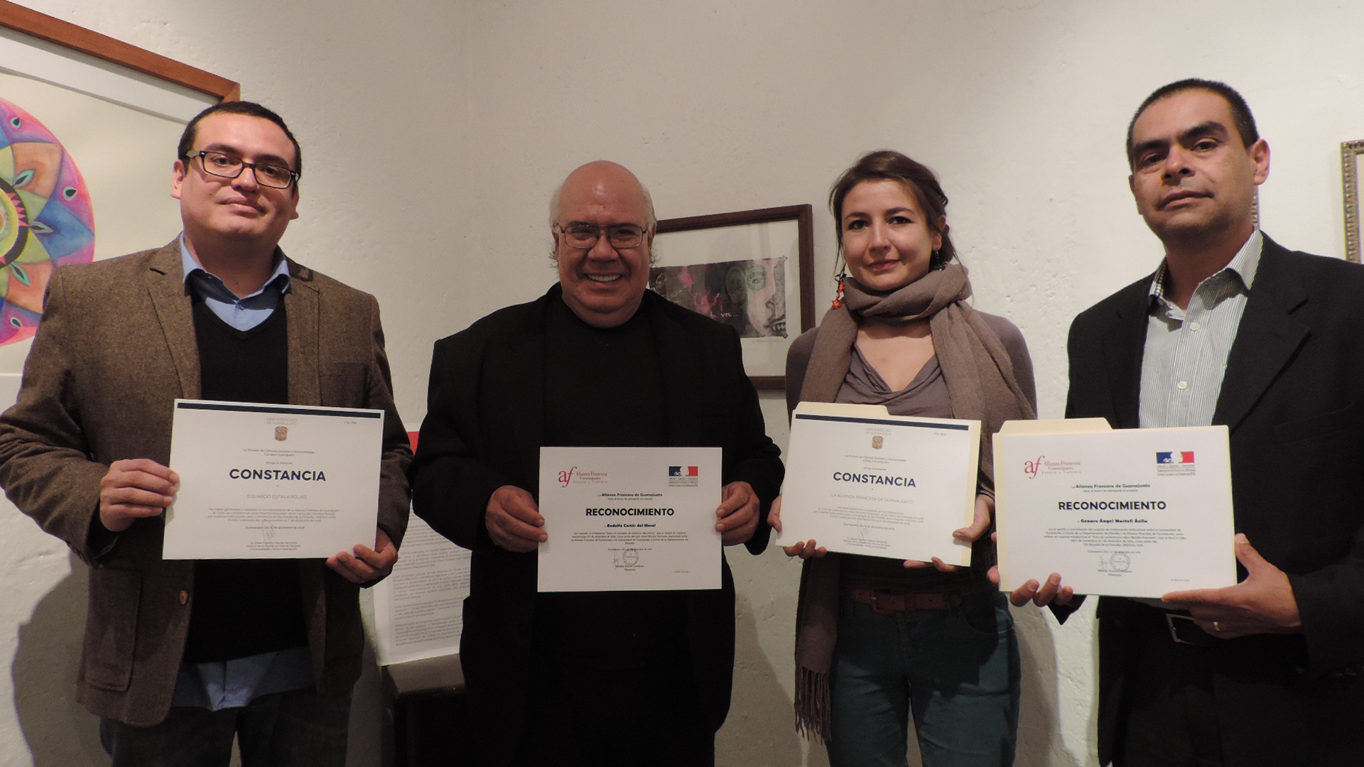 El 1 de diciembre de 2016, reciben reconocimientos mutuos de la Alianza Francesa de Guanajuato y de la Universidad de Guanajuato, México: Eduardo Estala Rojas, Director del Mexican Cultural Centre (MCC), Reino Unido; Rodolfo Cortés del Moral, Director del Departamento de Filosofía de UG; Maider Emma Landivar, Directora de la Alianza Francesa de Guanajuato; Genaro Ángel Martell Ávila, Responsable de Extensión y Vinculación del Departamento de Filosofía de UG. Por el acuerdo de colaboración institucional para realizar el «Ciclo de conferencias sobre filósofos franceses», como parte del Día Mundial de la Filosofía, UNESCO, 2016. Del 3 de noviembre al 1 de diciembre de 2016, se efectuaron con éxito cinco conferencias en las instalaciones de la Alianza Francesa de Guanajuato. Fotografía: Víctor Vallejo.